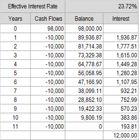 Loan Rs. 1,00,000. Transaction costs Rs. 2,000. Repayment 11 EMIs of Rs. 10,000 each and starts from the end of the first month of disbursement of the loan.