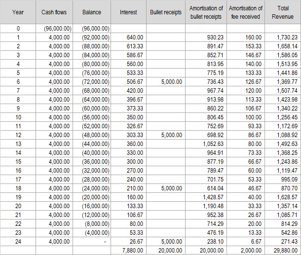The terms of an advance are as under: Loan Rs 96,000. Tenor: 2 years. Repayment of principal: Rs 4,000 pm Interest rate: 6-month MIBOR +2%. Bullet payments at the end of each half year amounting to Rs. 5,000 will be made. Upfront processing fee Rs. 2,000.