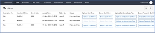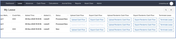 If you upload lease with Cash flow as “YES” then click the export cash flow. If the Cash Flow field is not ‘YES’ then the ‘Upload Cash Flow’ and ‘Export Cash Flow’ buttons will not be active. The Status of the record for which Cash flows should be updated will be shown as ‘New’.