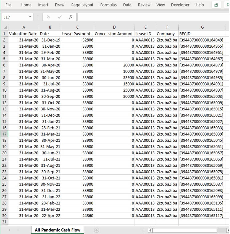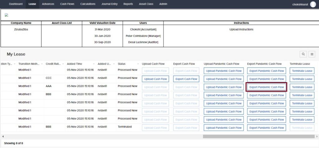 Export Pandemic cash flow for the concerned lease for which pandemic concession is given by the lessor. This will download a file ‘All Pandemic Cash Flows.csv’ showing the existing cash flows for the lease selected.